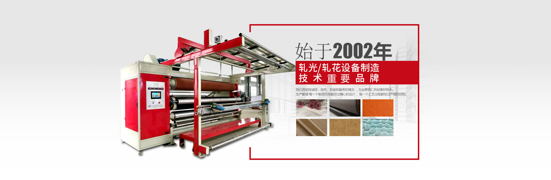 世界杯(中国)一站式服务官网生产轧光机,压花机,压光机,橡胶辊,羊毛辊,镜面辊等制造企业,技术力量雄厚,不断开发新产品,产品出口东南亚国家,深受客户好评。本公司技术力量雄厚,不断开发新产品,努力拓展国内外两大市场。产品出口东南亚国家,深受国内外客户好评。 本公司遵循注重质量、信誉至上的宗旨,共同发展的原则,为广大用户提供产品和服务。我们将坚持诚信、合作、双赢和服务的理念 ,与业界同仁共创美好明天。 生产管理 每一个制造阶段都经过精心的设计, 每一个工艺过程都经过严格的控制。